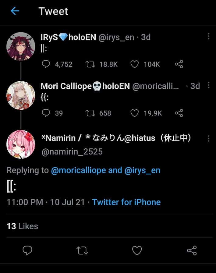 ちなみに完全な証拠にはなりませんがIRySのツイート「||:」に対して*なみりんが「[[:」とリプライを送っていることも理由の一つ。