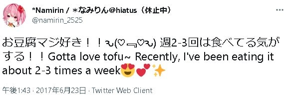 豆腐が本当に好きということをツイートしており、週に2回以上食べてることを報告するレベルで好きなようです。