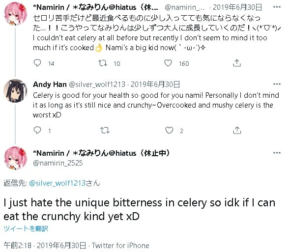 2019年6月30日にセロリは苦手だけど少しだけなら気にならなくなったという事をツイートしていました。