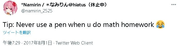 2017年8月1日には「数学の宿題をするときはペンを絶対に使わない」とリプライしていました。