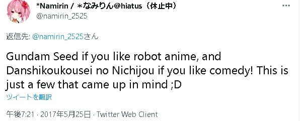 他の人宛にロボットアニメが好きならガンダムシード、コメディが好きなら男子高校生の日常をおすすめしていることがツイートから確認することが出来ます。