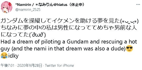 2020年9月28日にはガンダムを操縦してイケメンを助ける夢を見たことを報告していました。