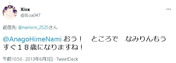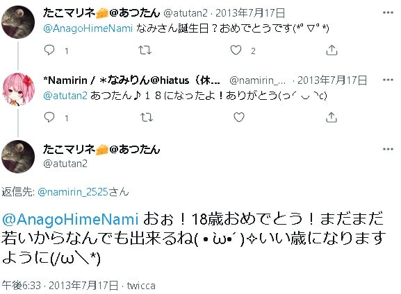 過去に使っていたID(@AnagoHimeNami)宛のツイートを確認したところ誕生日は7月17日で2013年に18歳になっていたことを確認することができました。
