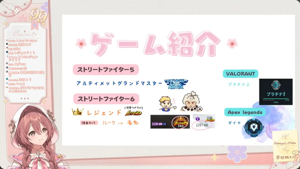| 主な配信内容 | ストリートファイター6 / VALORANT / Apex Legends |