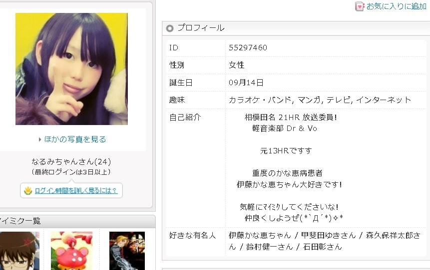 好きな有名人は伊藤かな恵ちゃん / 甲斐田ゆきさん / 森久保祥太郎さん / 鈴村健一さん / 石田彰さんとなっていました。