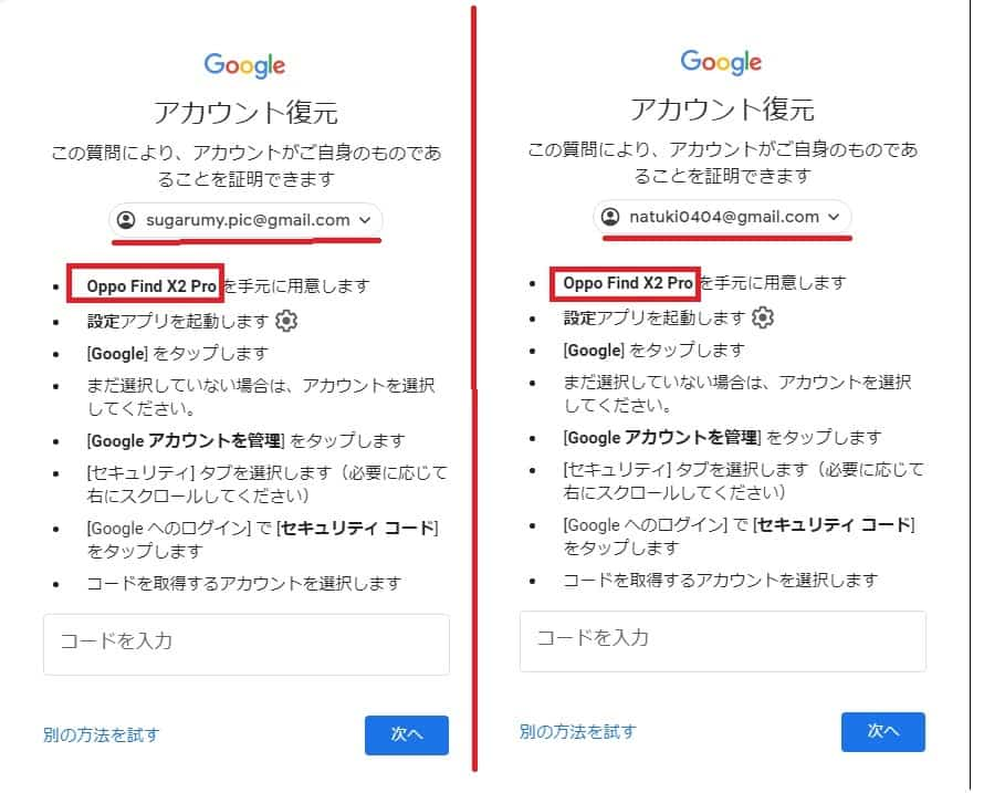 さとう瑠海のGoogleアカウント(sugarumy.pic@gmail.com)とNatukiのGoogleアカウント(natuki0404@gmail.com)に紐付けられている端末がどちらも「Oppo Find X2 Pro」となっています。