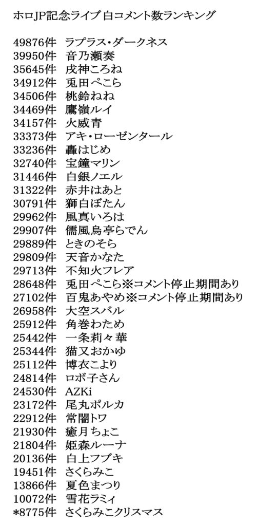 ホロの箱ってメンバーシップ数が一番多いのが35Pと考えると白コメが少ないというのは不思議ではないと思うのと、3期生が裏でやってたのでBGMにされており、白上のクリスマス会にみんな行ってしまい、普段から見ている層の再生数50万くらいになったと見ています。
