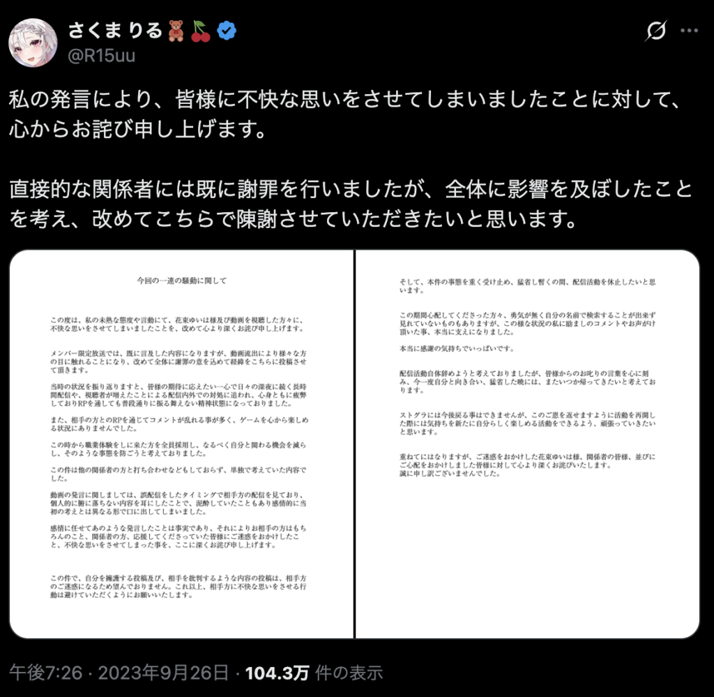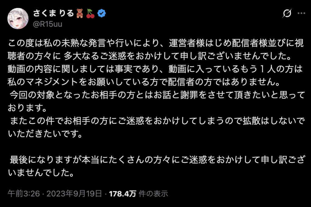 | 2023年9月19日 | 問題の音声が配信に流出。さくまりるさんが即日謝罪 |