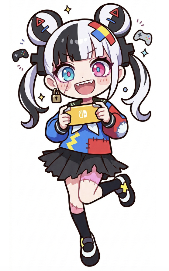 一方、配信モードではゾンビとしてのツギハギだらけの全身を堂々と晒し、頭には絆創膏のようなバッジ、赤と青のツギハギに綿が出ているブレザーとボロボロのミニスカという大胆な衣装に変身。