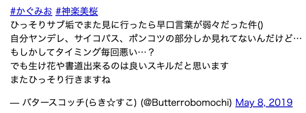 そして、神楽美桜も当時のリスナーから「ライブライブ好き同士」とリプを貰っているため、ラブライブが好きなことがわかりますね。